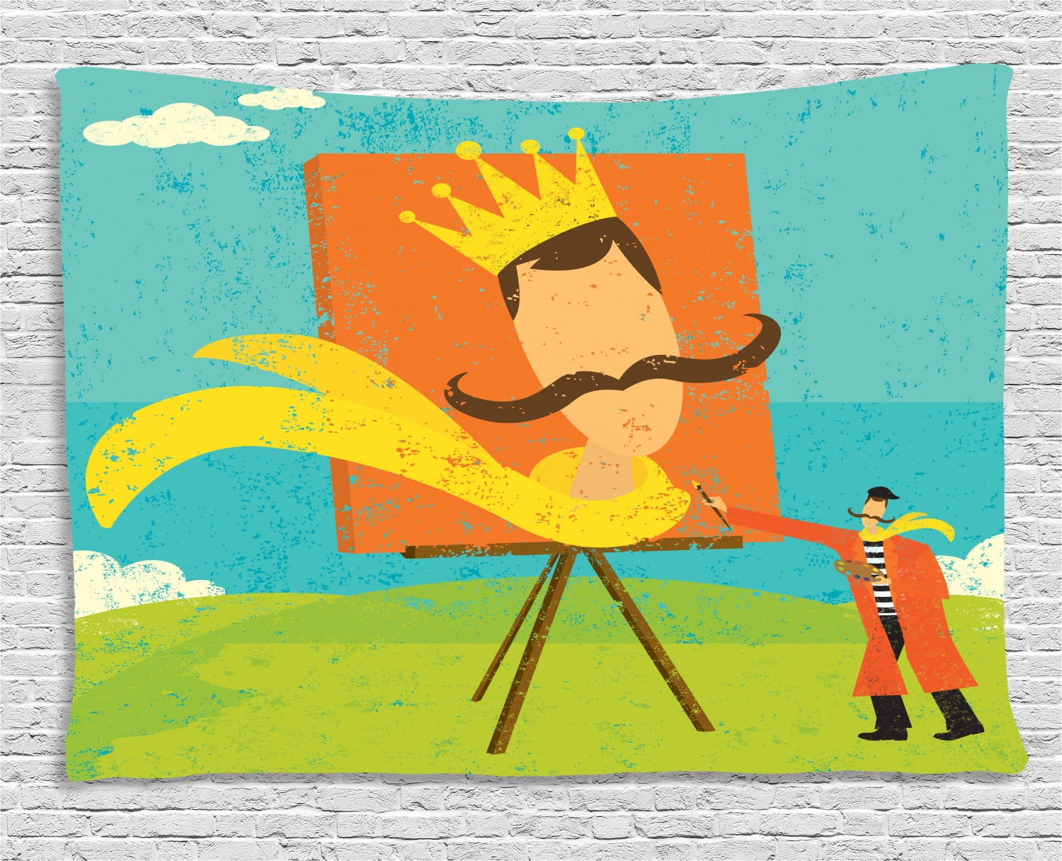 Retro Tapestry Cartoon Artist Painting His Giant Portrait In A Crown On Hill Grunge Weathered Effect Wall Hanging For Bedroom Living Room Dorm Decor 80w X 60l Inches Multicolor By Ambesonne
